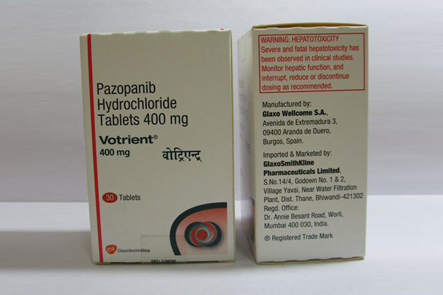 在一组临床试验中,两组患者(晚期软组织肉瘤)分别服用800 mg帕唑帕尼和安慰剂。用药组无进展生存期明显延长(4.6月 vs 1.6月);同时用药组的无进展生存期也要长于对照组(2.0月 vs 1.7月)