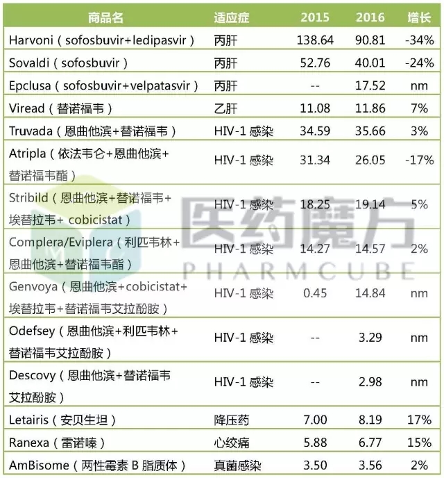 吉利德2月7日公布了2016年财报,全年总收入303.9亿美元,相比2015年的326.4亿美元下滑6.7%。抗病毒系列产品2016年合计带来277亿美元销售收入,相比2015年下降25亿美元,在吉利德总收入中的占比则从92.6%下降至91.1%。Gilead具体产品的2016年销售额见下表: