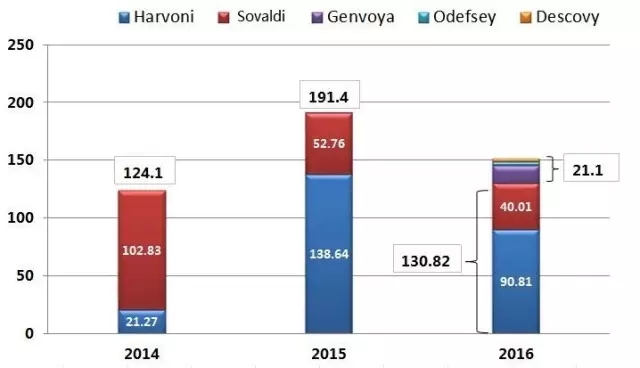 从数据来看,Sovaldi和Harvoni在2014年为Gilead合计带来124.1亿美元的销售收入,2015年Sovaldi销售额腰斩缩水50亿美元,但Harvoni大爆发,两大神药再为Gilead带来191.4亿美元的收入。到了2016年,Harvoni和Sovaldi联合上演大衰退,给Gilead挖了一个60亿美元的大坑。