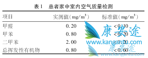 进一步行室内空气质量检测(执行标准GB/T18883-2002)结果见表1。室内空气质量检测结果示甲醛、甲苯、二甲苯等均超标,尤以甲苯、二甲苯超标严重。