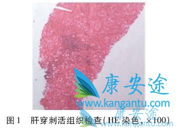 肝穿刺活组织检查示肝细胞区域性水样变性,散在点灶状坏死,偶见融合灶状坏死;肝窦内少量单个核细胞浸润,偶见分叶核白细胞;汇管区轻度扩大,纤维组织轻度增生,中等量以单个核细胞为主的炎细胞浸润,轻-中度界面炎(图1)。