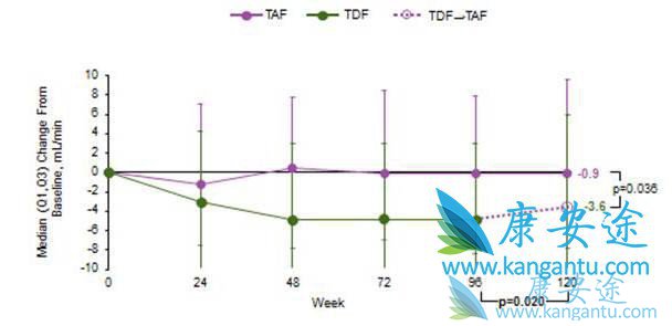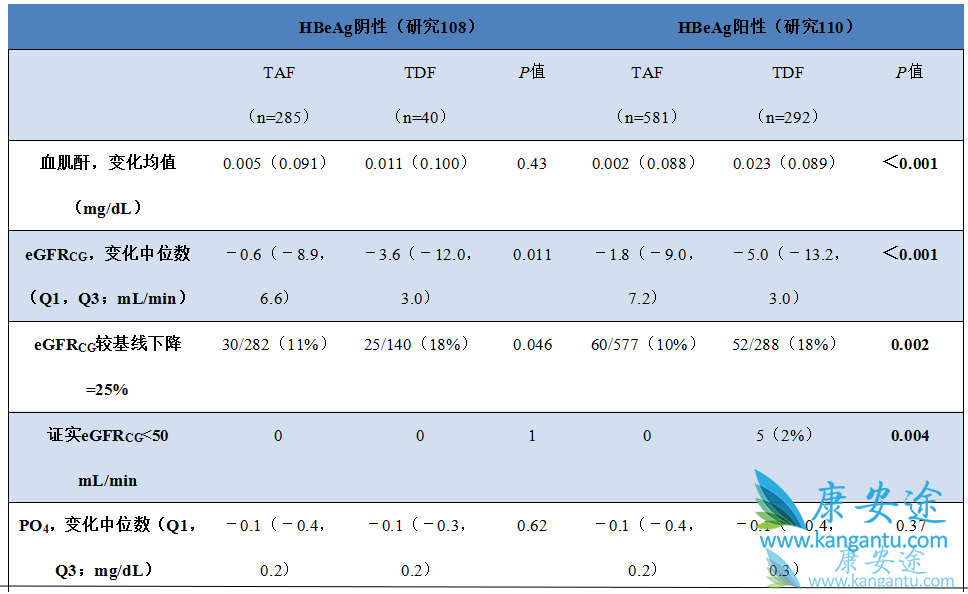 表1. TAF和TDF治疗期间患者肾功能指标的变化