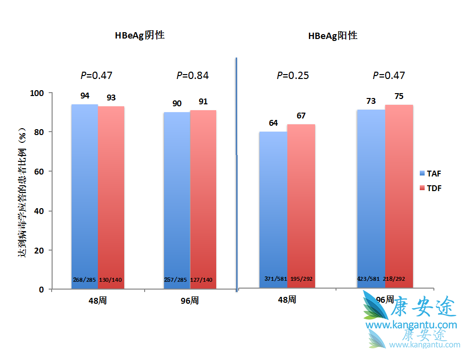 图2. TAF与TDF治疗慢乙肝患者48周和96周的病毒学应答(HBV DNA<29 IU/mL)