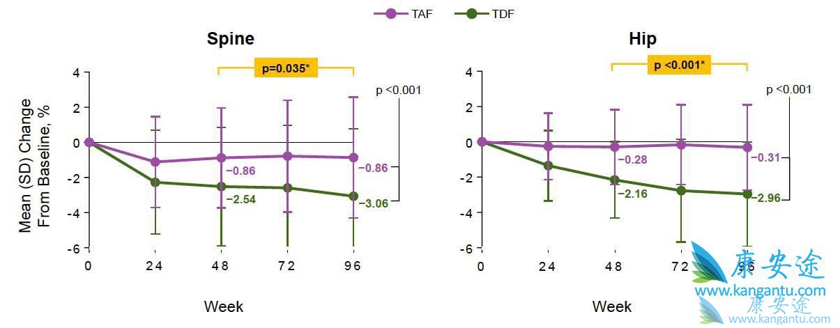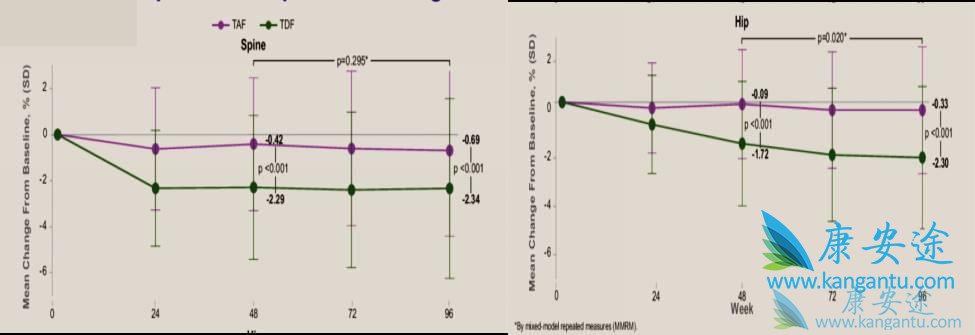 (上图:HBeAg阴性患者,下图:HBeAg阳性患者;可见TAF组的BMD下降更少,而且这个差异在96周更加明显)