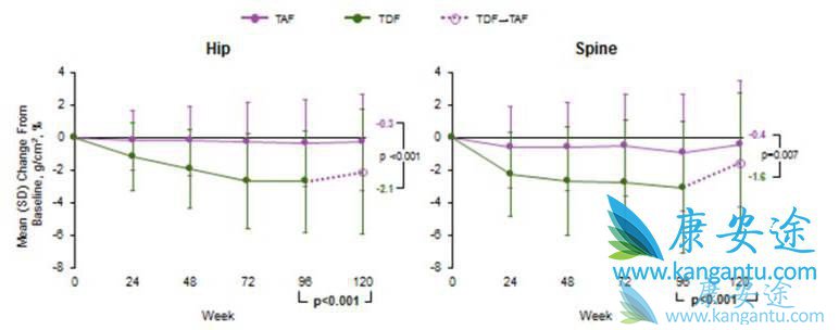 图3. TAF和TDF治疗期间患者髋关节(hip)和脊柱(spine)骨矿物质密度的变化
