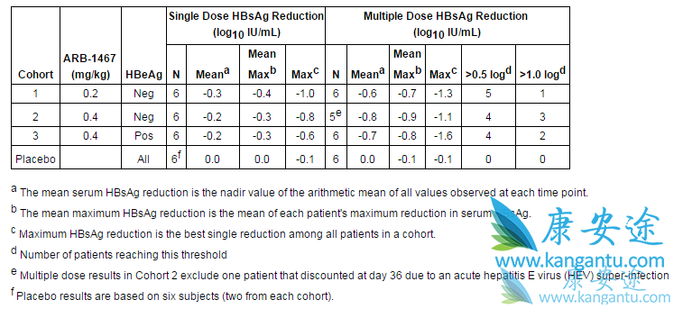 II期试验是慢性HBV患者的多剂量研究,他们也接受了稳定的核苷(酸)类似物治疗。该试验由四个队列组成,其中前三组队列每队有8名对象(6个接受三个月剂量的ARB-1467和2个接受安慰剂),队列4纳入12个患者(所有患者将接受5个次剂量的ARB-1467(每两周一次)。队列1,2和4包括HBeAg患者,队列3包括HBeAg +患者。对于符合预定义的反应标准的患者,队列4的方案允许将剂量延长至长达一年的ARB-1467给药量。