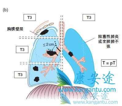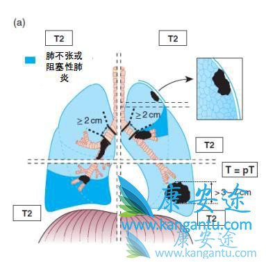 2.主要肿瘤离支气管小于2cm,但不侵袭阻塞性肺炎或全肺肺不张;