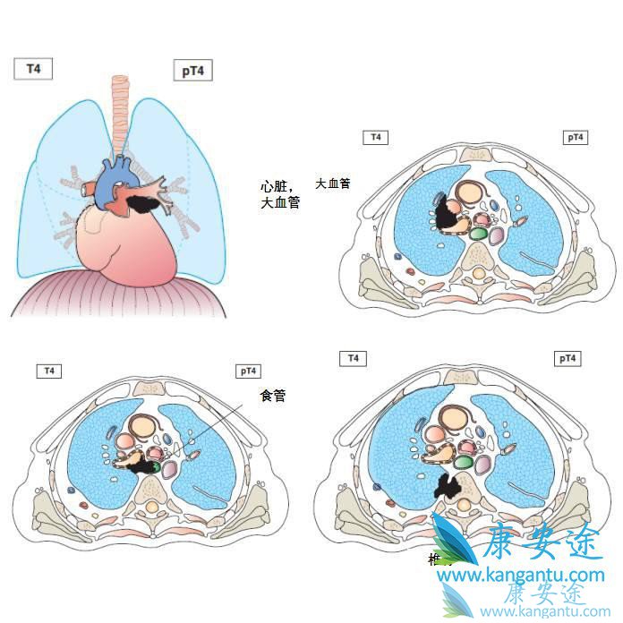 1.肿瘤最大径>7 cm,直接侵犯以下任何一个器官:胸壁(包含肺上沟瘤)、隔膜、膈神经、心包;