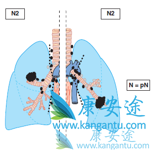 同侧支气管周围及(或)同侧肺门淋巴结以及肺内淋巴结有转移,包括直接侵犯而累及的。