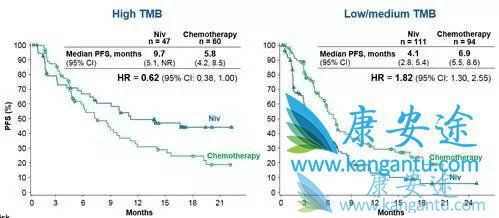该研究发现,在TMB高表达的病人中,采用Opdivo进行治疗后,客观缓解率(ORR,47% vs 28%)和无进展生存期(PFS,9.7 vs 5.8个月)均显著优于化疗[1],这一结果让Opdivo成为NSCLC一线用药重燃希望。