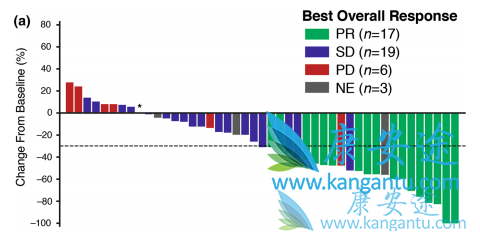主要观察终点:中位疾病进展时间TTP为7.4个月(参照mRECIST IRRC)。17例(37%)获得了肿瘤缩小和19个病人(41%)肿瘤稳定,简单来说,也就是合计78%的患者肿瘤没有长大。中位总生存期达到了18.7个月。