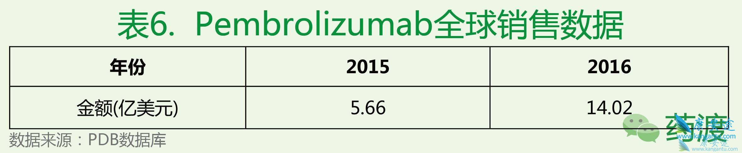 2016年Pembrolizumab的全球销售额14.02亿美元,同比增长148%。位居同年全球药品排行榜第81位。