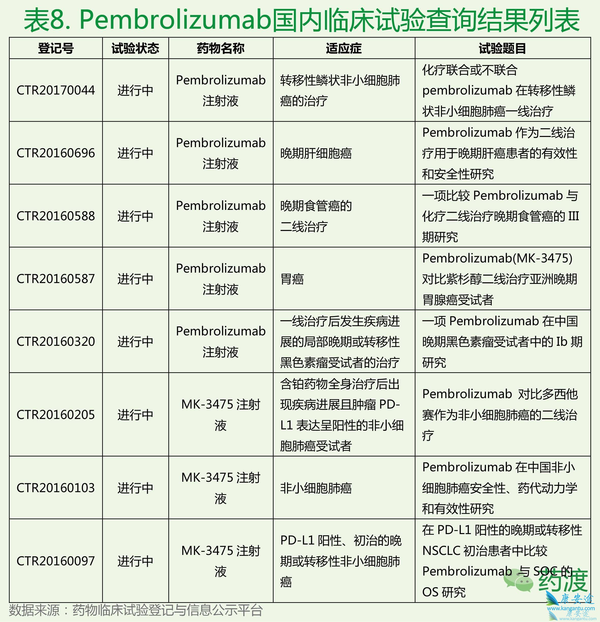 Pembrolizumab原研企业已在国内申请临床,并于2016年批准临床。详细申报情况如下表7所示。从药审中心临床试验备案平台上查询可知,目前有多项临床试验正在进行中(见表8)