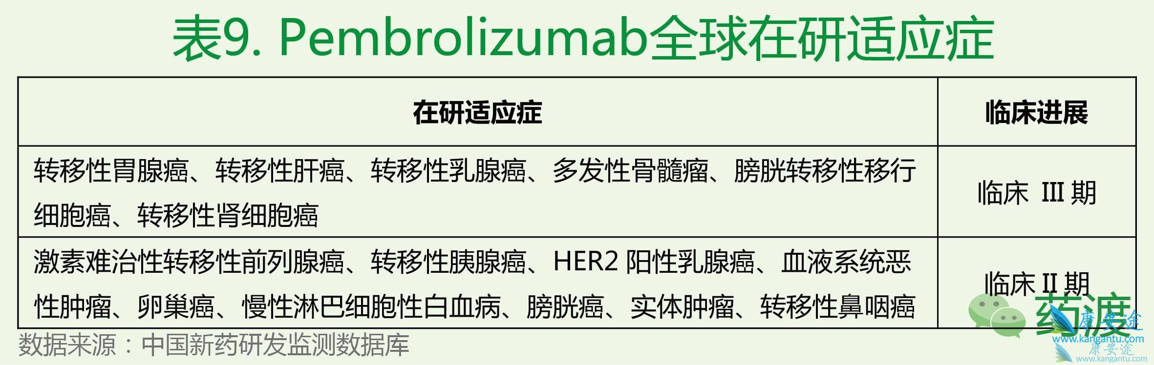 目前在研适应症如下,可谓紧随Nivolumab的脚步,Pembrolizumab适应症的进一步扩展也将与Nivolumab形成更加强有力的抗衡。