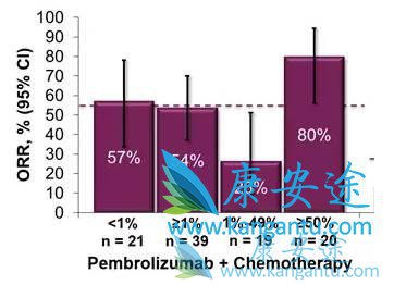 在对PD-L1表达状态的评估中,Keytruda联合化疗组的PD-L1表达<1%的患者客观缓解率ORR为57%(12/21),而化疗组为13%(3/23)。在PD-L1表达>1%的患者中,Keytruda联合组的客观缓解率ORR是54%,而化疗仅占38%。在PDL1≥50%的患者中,两组的有效率分别是80%和35%。