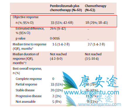 单纯AC方案化疗组的有效率是29%,pembrolizumab联合化疗的有效率是55%。几乎达到2倍。有明显的统计学差异。中位起效时间免疫联合化疗组也要明显早于单纯化疗组,分别是1.5月:2.7月。