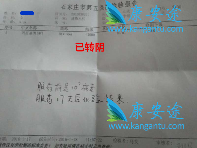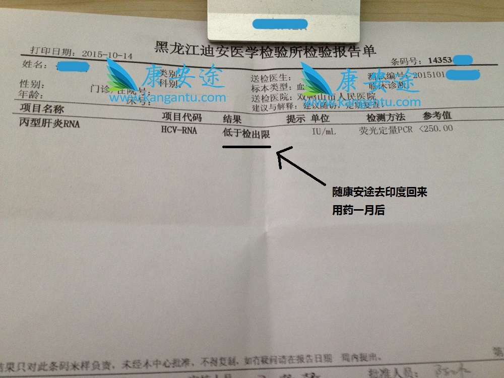 辽宁J女士,去印度治疗前病毒数为4.50E+05,即450000 IU/ml,J女士不想用干扰素,身体状况不允许。在8月底她在康安途的帮助下在印度知名医院Medanta看病并顺利拿到吉利德原产索非布韦,回来用药两周,去医院检测发现病毒为<1E3,即小于1000IU/ml,已转阴。... [详细]