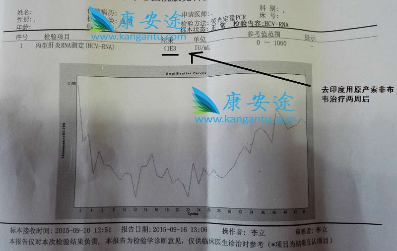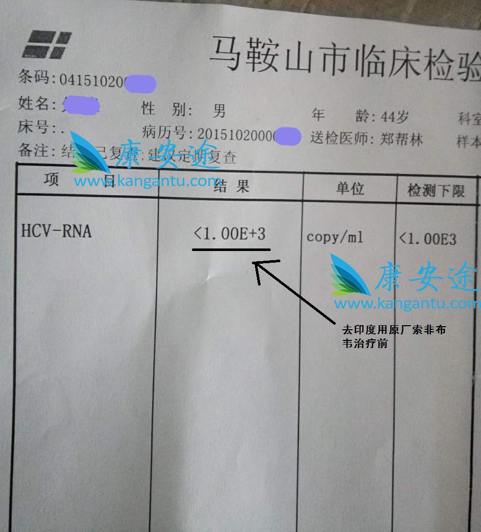在印度前病毒数为9.35E+05,即935000 IU/ml,在他得知通过康安途可以在印度拿到原产索非布韦之后,他决定随康安途去印度治疗。在印度顺利的拿到了美国吉利德原产索非布韦用药一个月已转阴。... [详细]