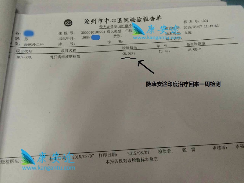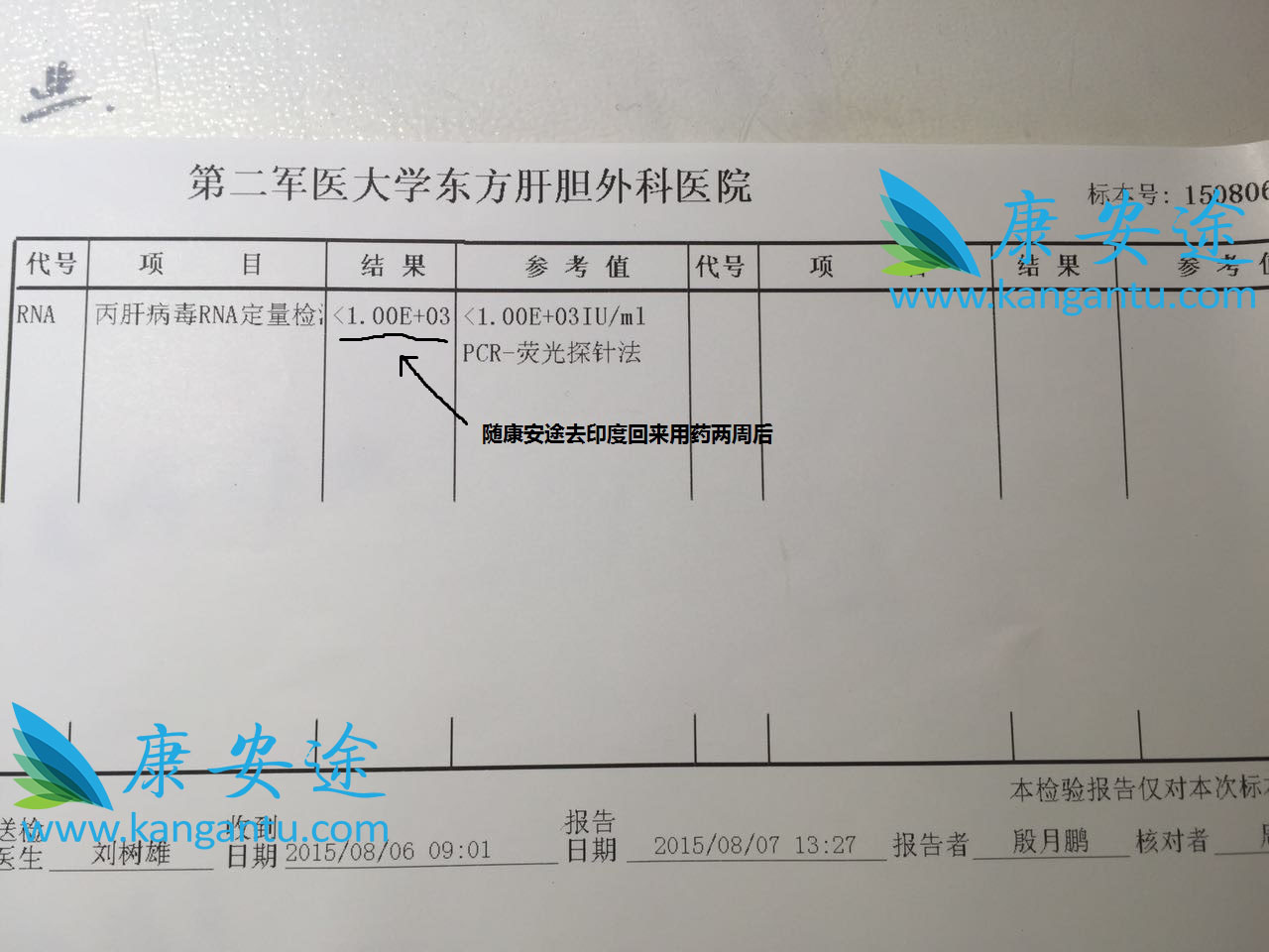 上海的Z先生,在去印度治疗之前,病毒滴度的值为1.00E+07,即10000000 IU/mL,7月份,Z先生随康安途去印度Medanta医院治疗并在医院药房拿药,回国后用索非布韦两周后检测,99.999%的病毒已被清除。... [详细]