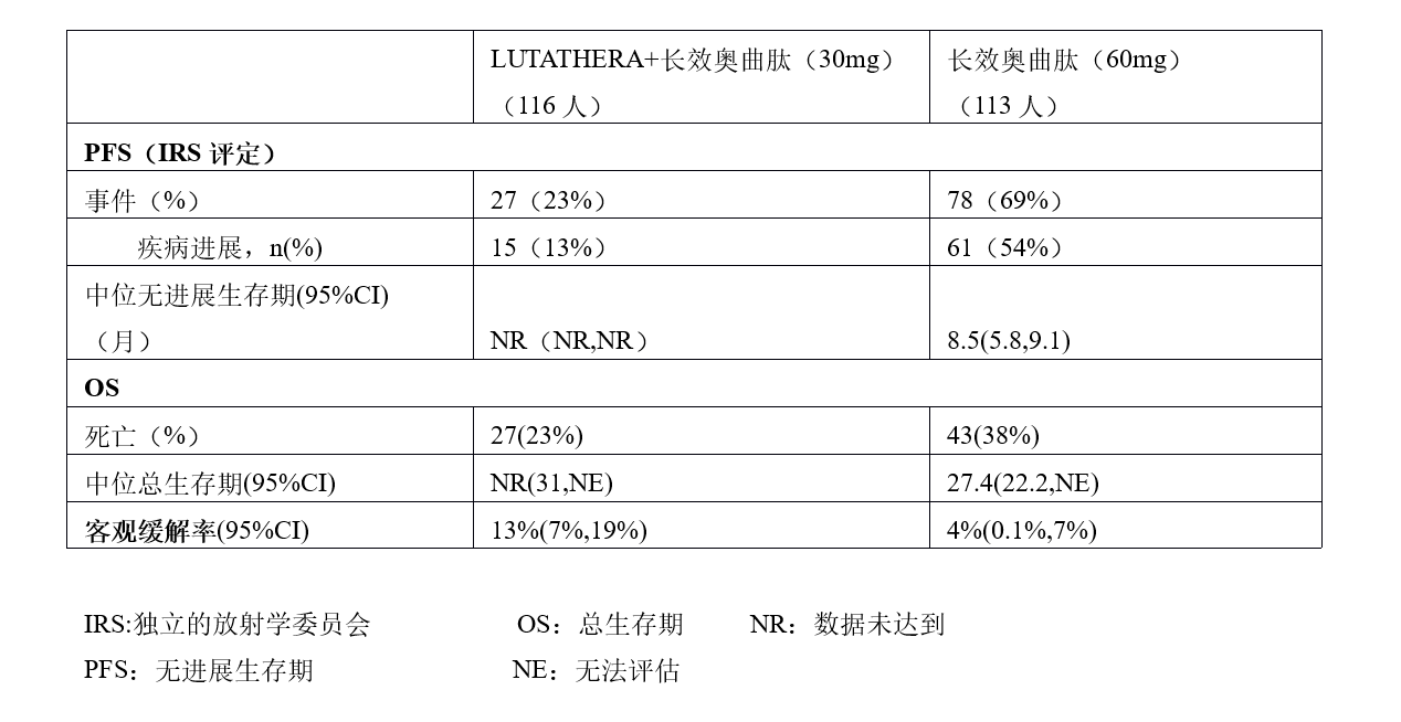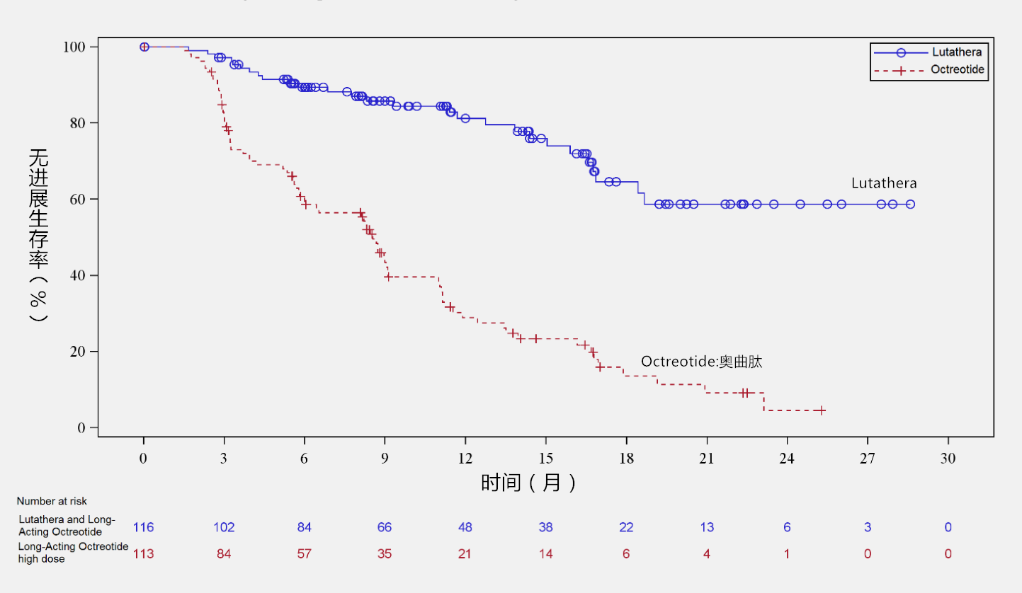 在这项研究中,与仅使用长效奥曲肽的患者组相比,使用LUTATHERA+长效奥曲肽治疗的患者发生肿瘤的进展或死亡的风险降低了79%。LUTATHERA组中位无进展生存期(PFS)还没有达到(也就是说PFS更长),而大剂量奥曲肽组的中位PFS为8.5个月。