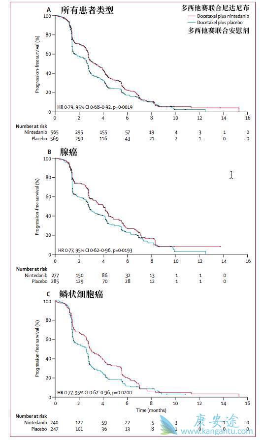 试验结果表明使用尼达尼布的功效与作用更好,优于单药多西他赛。如上图所示,多西他赛联合尼达尼布的无进展生存期(PFS)优于安慰剂联合多西他赛。这个疗效的差异不管是腺癌和鳞状细胞癌都是很明显的。但是在总进展生存期(OS)方面,尼达尼布联合多西他赛仅在腺癌这个癌症种类中优于单药多西他赛。基于LUME-Lung 1临床III期的结果,欧盟批准尼达尼布联合多西他赛治疗一线化疗失败的进展期非小细胞肺癌。