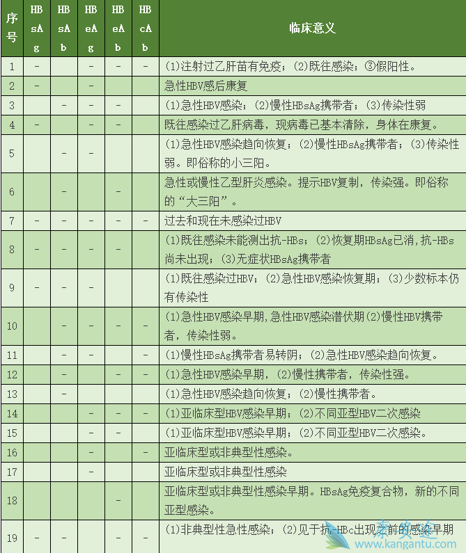 定性检查只能看得出阳性阴性,一般适用于那些不清楚自己有没有乙肝,初次体检的患者。定量检查不仅可以看出阳性还是阴性,还可以进一步量化,目前主要用于正在治疗的乙肝患者,可以通过量的比较来判断疗效如何,尤其是干扰素治疗的患者。康安途为大家总结的乙肝五项对照表如下:
