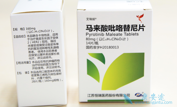 中国恒瑞新药吡咯替尼(商品名:艾瑞妮)通过不可逆地阻断HER1、HER2、HER4酪氨酸激酶,Ⅱ期临床研究证实疗效优于可逆性HER1、HER2酪氨酸激酶抑制剂拉帕替尼,2018年8月12日获得中国国家药品监督管理局(NMPA)批准上市。