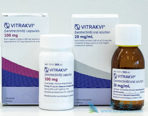 拉罗替尼Vitrakvi(larotrectinib)为Bayer 和Loxo Oncology 共同开发,2018年11月27日获得FDA批准上市,用于治疗携带 NTRK 基因融合的晚期实体瘤患者。2018年10月ESMO年会上公布,在55名可以用 RECIST 标准衡量的TRK融合癌患者中,拉罗替尼能够达到80%的ORR。国内为上市。