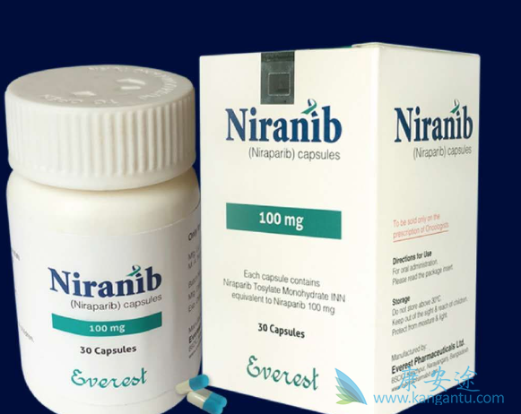 尼拉帕尼用于化疗后复发的晚期卵巢癌的III期临床数据,结果显示对有BRCA基因突变的卵巢癌,每日口服尼拉帕尼一次,中位无进展生存期为21个月,而对照组(使用化疗)的病人,只有5.5个月,前者是后者的接近的4倍,而对于未突变患者,也有9.3个月,超过安慰剂的两倍。尼拉帕尼原研药价格非常贵,据说一个月要超过十万,吃得起的少之又少,现在孟加拉仿制的尼拉帕尼已经成功上市,由everest生产,瓶装,每瓶30粒,100毫克的规格,一个月需要3盒,价格比原研药便宜了很多。