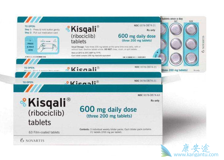 KISQALI片剂与芳香酶抑制剂或氟维司群一起口服,含或不含食物。推荐起始剂量:口服600毫克(三片200毫克片剂),连续21天每天服用或不服用食物,连续服用7天。基于个体安全性和耐受性,可能需要剂量中断,减少和/或中断。