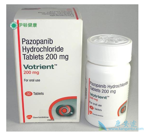 帕唑帕尼可以抑制住血管内皮生长因子受体(VEGFR)-1、VEGFR-2、VEGFR-3、血小板衍生生长因子受体(PDGFR)-和-、纤维母细胞生长因子受体(FGFR)-1和-3、细胞因子受体(Kit)、白介素-2受体可诱导T细胞激酶(Itk)、白细胞-特异性蛋白酪氨酸激酶(Lck)、和穿膜糖蛋白受体酪氨酸激酶(c-Fms)的一种多-酪氨酸激酶抑制剂。服用剂量:800 mg口服每天1次不和食物一起服药(至少在进餐前1小时或后2小时)。基线中度肝损伤 – 口服200 mg每天1次。严重肝损伤患者不建议使用。