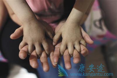 欣欣握着妈妈的手,经过长期化疗,她的肤色有些苍白。
