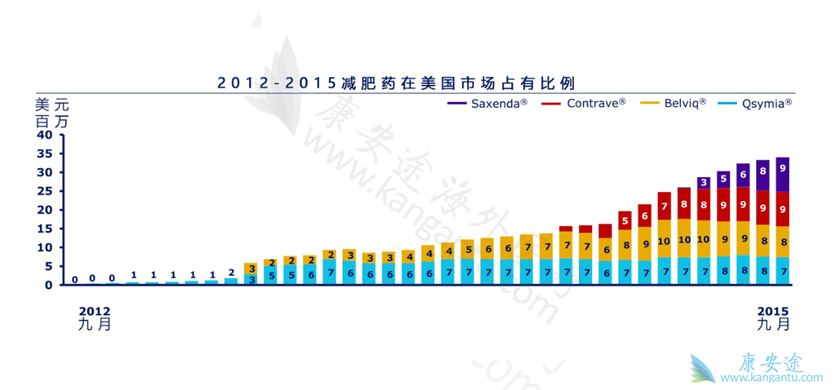 上图显示2012-2015年美国减肥药市场的销售份额占比,虽然Saxenda®于2015年01月通过FDA批准上市,但是可以看出它的市场份额占比仅在2015年这一年并不输给其他三种减肥药物。