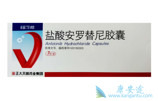 盐酸安罗替尼胶囊,又名福可维,是由正大天晴研发,是一款国产靶向药。目前获批的适应症为既往至少接受过2种系统化疗后出现进展或复发的局部晚期或转移性非小细胞肺癌患者的治疗。对于存在EGFR基因突变或ALK阳性的患者,在开始安罗替尼治疗前应接受相应的靶向药物治疗后进展、且至少接受过2中系统胡里奥后出现进展或复发。