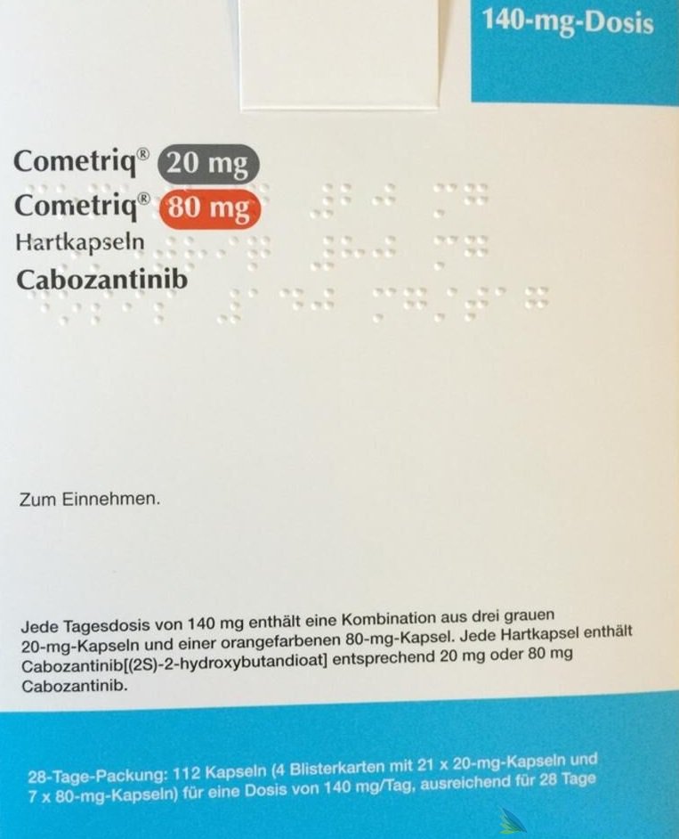 康安途主要给大家说说卡博替尼(Cometriq)的最新进展。第一是用于一线肾癌治疗,打破了尘封十年的记录,根据JCO发表的最新临床数据,卡博替尼(Cometriq)在肾癌一线治疗中刷新了尘封十几年的数据,完爆肾癌一线用药——舒尼替尼(索坦)。研发人员发现这药明显比索坦好多了,会尽快申请FDA的批准。招募157位晚期初诊的肾癌患者,一线使用184(79人)或者舒尼替尼(78人)。184剂量每天60mg;舒尼替尼剂量每天50mg,用4周,停2周。临床数据显示:卡博替尼(Cometriq)VS舒尼替尼,有效率46% VS 18%,无进展生存期8.2个月 VS 5.6个月,更重要的是总生存期30.3个月 VS 21.8个月。