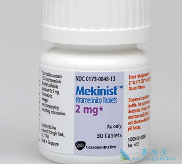 曲美替尼(trametinib)是在2013年由美国FDA批准上市的口服片剂,可用于治疗不可切除或转移性黑色素瘤。大量的研究发现,原癌基因的活化可改变丝裂原活化蛋白激酶(MAPK/MEK)突变,继而产生毒性,催化黑色素瘤的产生。曲美替尼则是一种丝裂原活化细胞激酶的可逆性抑制剂,通过减少刺激肿瘤细胞生长增值的蛋白合成从而抑制细胞增殖。大量的临床实验证实此药可有效抑制突变黑色素瘤细胞的生长。
