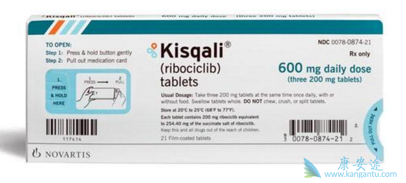 KISQALI片剂与芳香酶抑制剂或氟维司群一起口服,含或不含食物。推荐起始剂量:口服600毫克(三片200毫克片剂),连续21天每天服用或不服用食物,连续服用7天。基于个体安全性和耐受性,可能需要剂量中断,减少和/或中断。