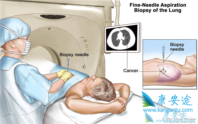 (肺活检。患者平躺,通过(CT)机器帮助医生看到肺部异常组织的位置。活检针穿过胸壁插入肺组织异常区域。通过针头取出一小块组织,并在显微镜下检查癌症的迹象。)