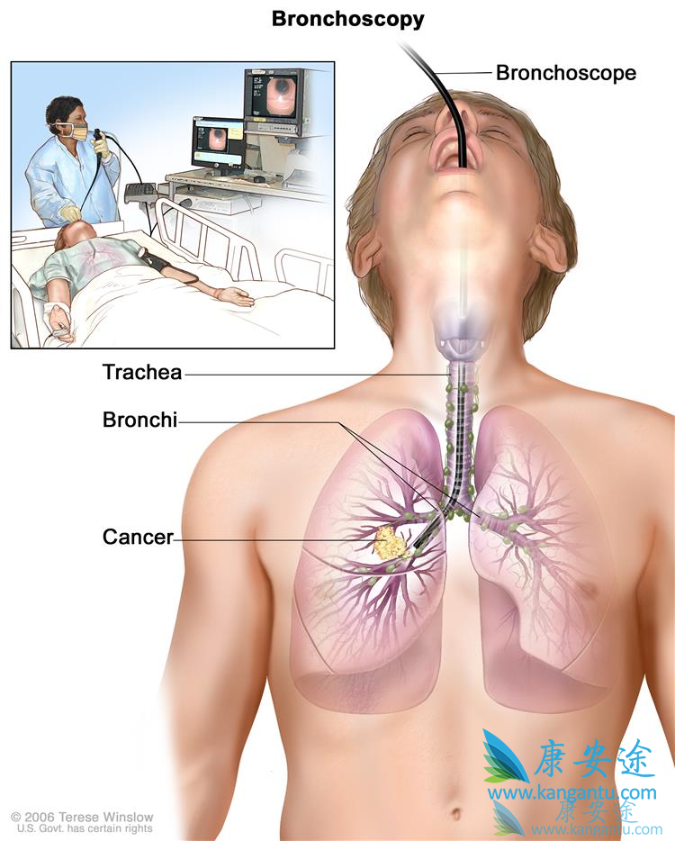 • 支气管镜检查:支气管镜通过鼻或口腔进入到气管中。支气管镜是一种很薄的管状仪器,带有光源和透镜方便观察。同时可以取出组织样本,在显微镜下进一步观察。